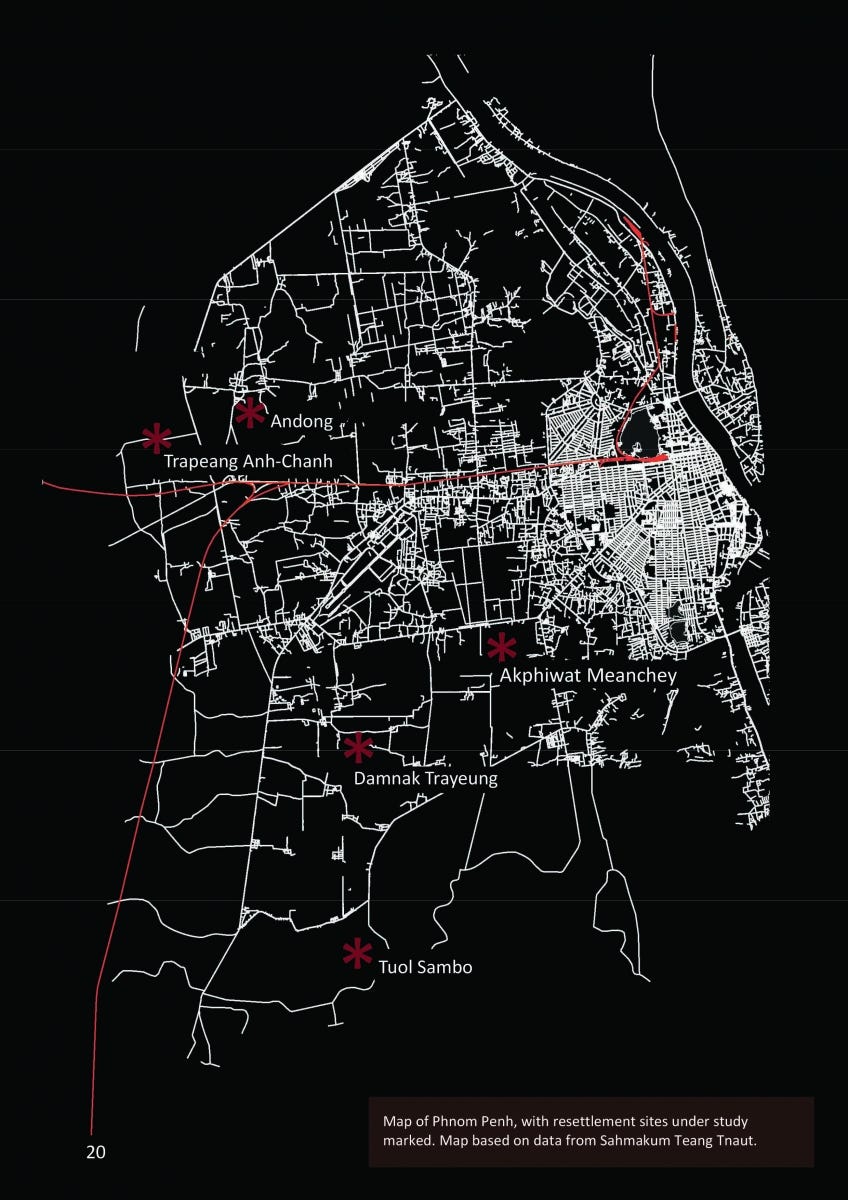 近十幾年來,由於都市開發大規模人口遷移,首都金邊市區的移動也造成許多地區的安置議題,如 Akphiwat Meanchey(或Veng Sreng)、Meanchey(中國大使館附近的前路站點居民)Dangkor區、現Andong(原來自Sambok Chab)、現Damnak Trayeung / Dangkor 區(原來自 Dey Krahorm)、Tuol Sambo/Dangkor 區(原來自Borei Keila)、Trapeang Anh — chanh/Dangkor 區(原來自 Sambok Chab)等。進到這些生活環境與條件相對較差的地區,可明顯感受到社會中位處兩端差異。