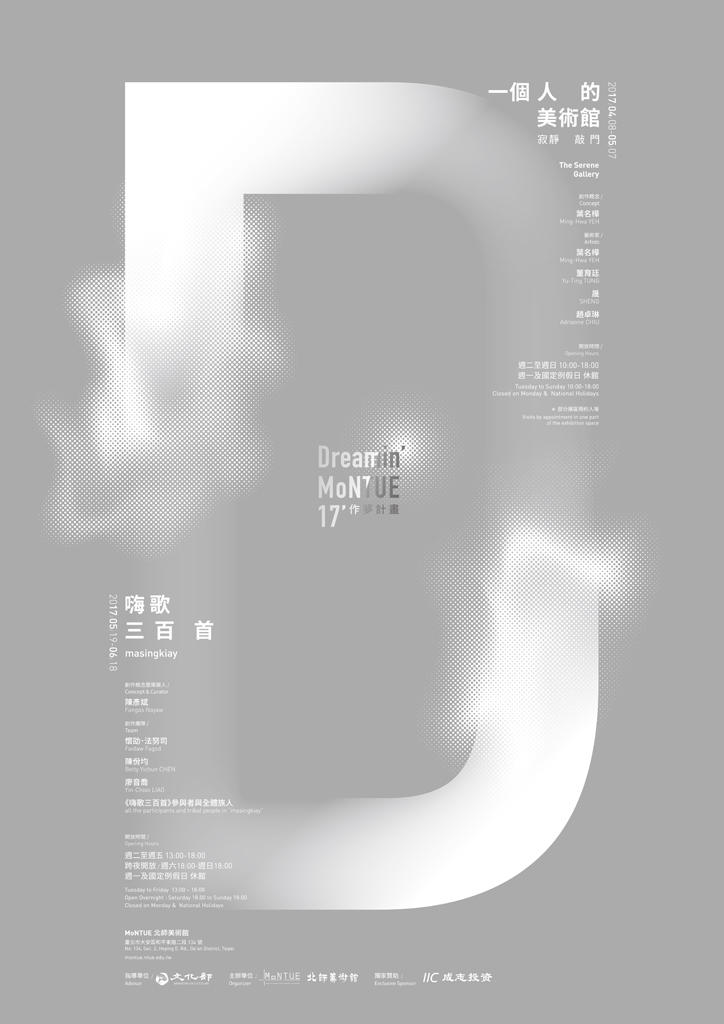 Editor, Exhibition Brochure Yōga: Modern Western Paintings of Japan(2017.10-2018.01), L’OURVE 9 (2015.11-2016.02), 2017 Dreamin’ MoNTUE (2017.04-06)-The Serene Gallery, masingkiay, The13th and 14th Taishin Arts Award Exhibition(2015.05-2017.07 & 2016.05-2016.07), No No Sleep at MoNTUE -Tsai Ming-Liang Solo Exhibition(2016.03-2016.04), etc.