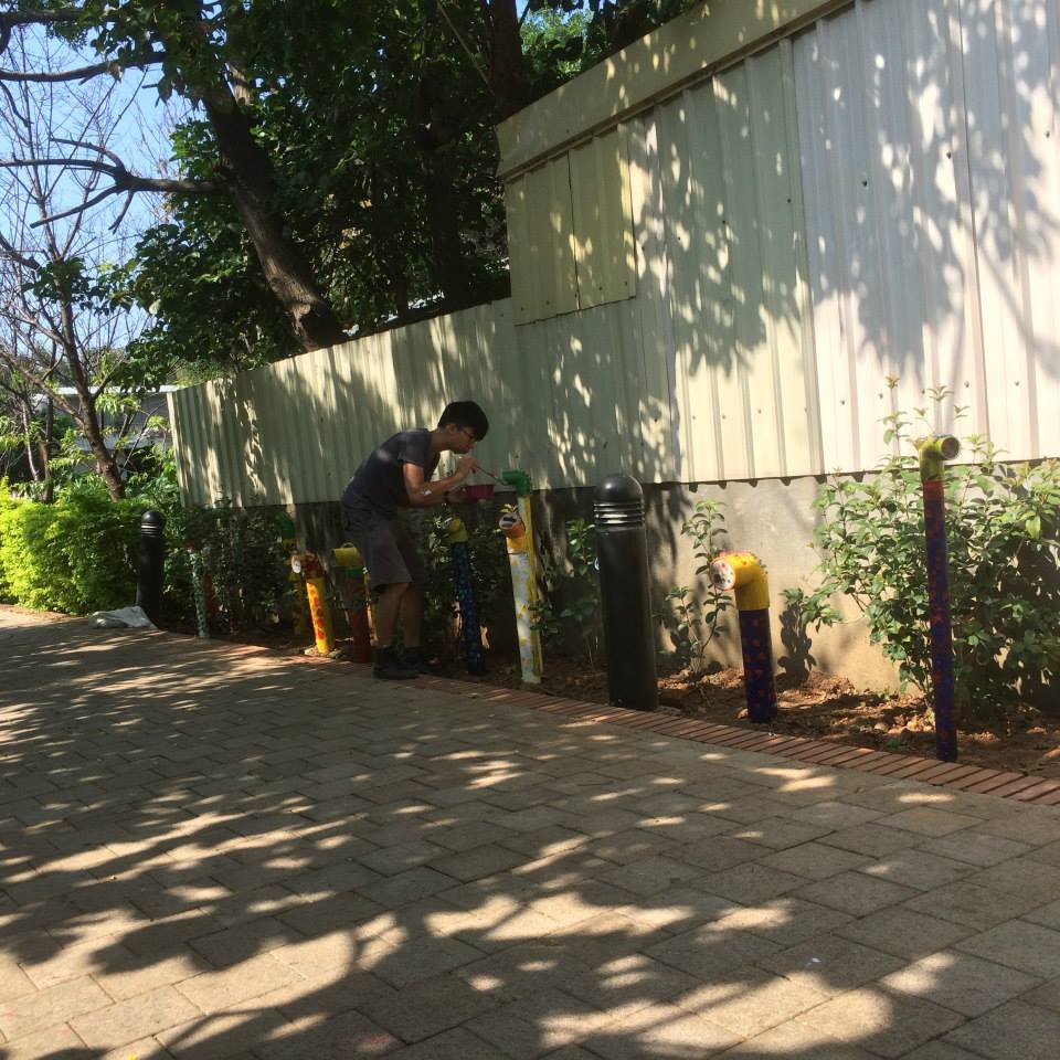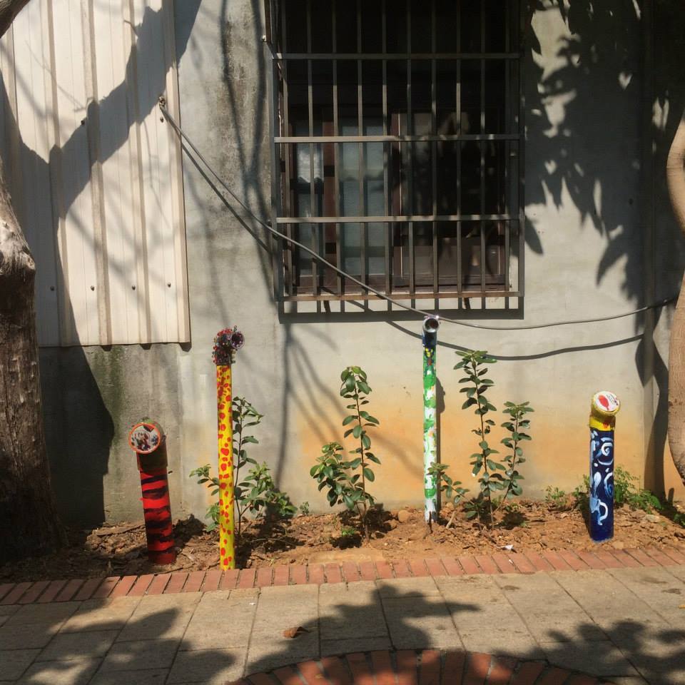 完成與小朋友們(新奇屋幼兒園)精彩作品的安裝,在新屋水巷裡(近新屋鄉公所後),有43支潛望鏡正從水裡冒出土來,小孩們發揮想像力,在思考水上與水下的環境,有對自己家的記憶,有令自己著迷的事物,發揮在每個鏡口的圖像上,在鏡身則是由內心對立體物件的創作。