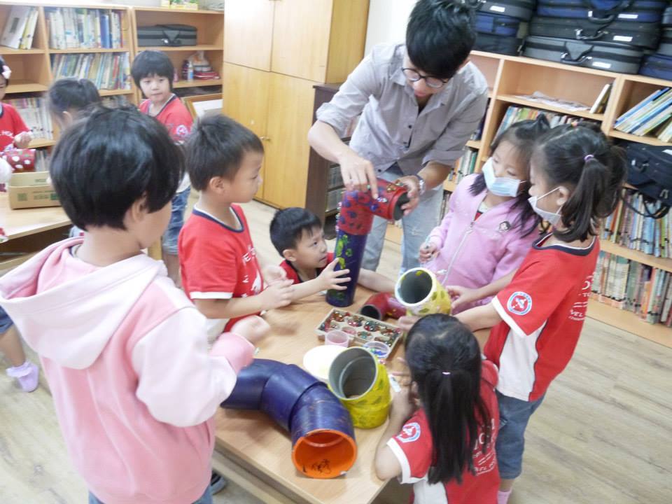 Under the “command” of Sur.layer artists Lin Shu-Hao and Captain Chu Hsiao-Chi, the children set off on a submarine adventure. Through their creative work, the artists invite them to imagine what lies beneath the road — and to reflect on environmental hygiene and ecological awareness. Together, the artists and children made a variety of three-dimensional periscope sculptures to guide visitors along the water lanes, as well as L-shaped sculptures scattered throughout the space to bring artistic vitality to the area. Local journalists from southern Taoyuan came to cover the event.